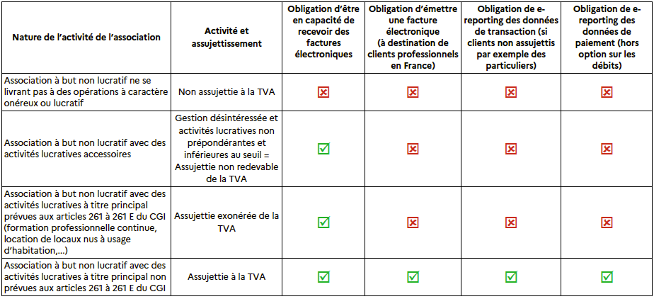 - si l’association réalise des prestations de services, l’opération fera également l’objet d’une transmission des données de paiement (e-reporting de paiement), une fois que la prestation aura été payée.