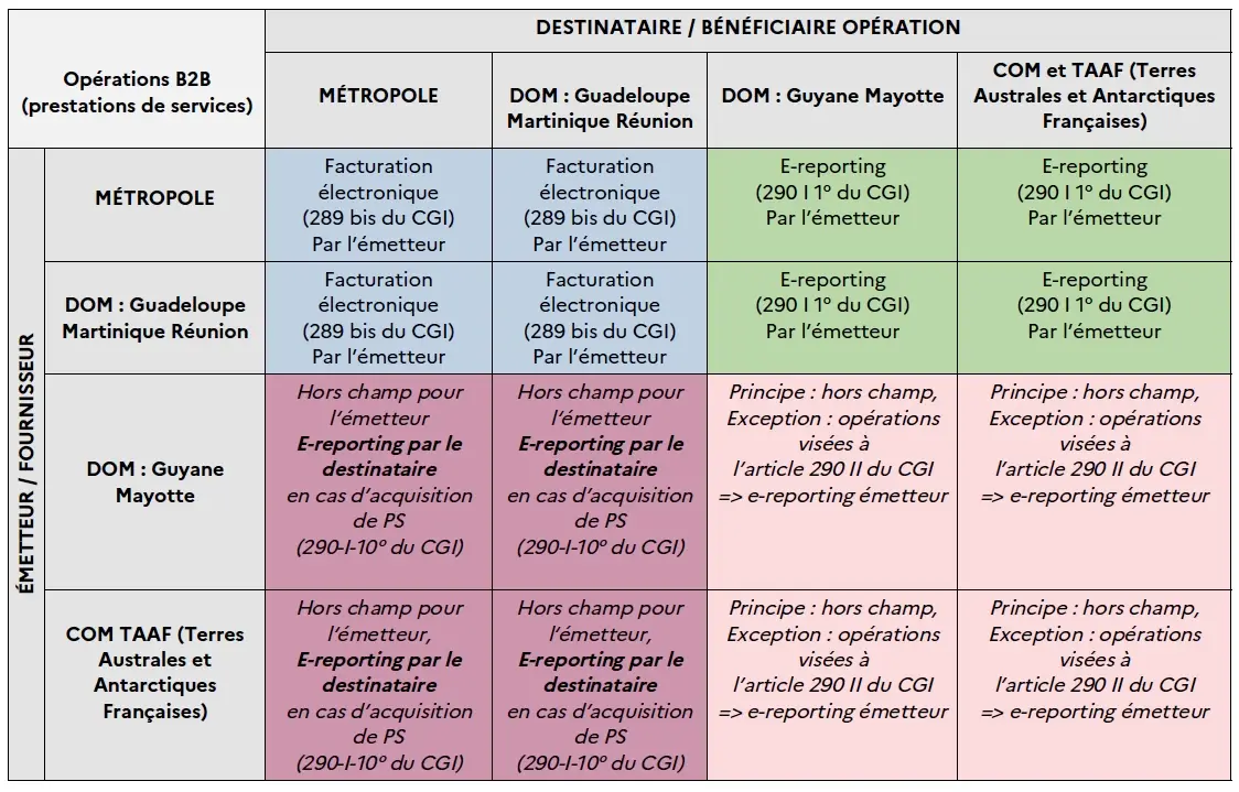 Les obligations – facture électronique ou e-reporting de transaction et de paiement – diffèrent selon la qualité du destinataire de l’opération (assujetti ou non assujetti) et le lieu d’implantation du fournisseur ou du client de la transaction.